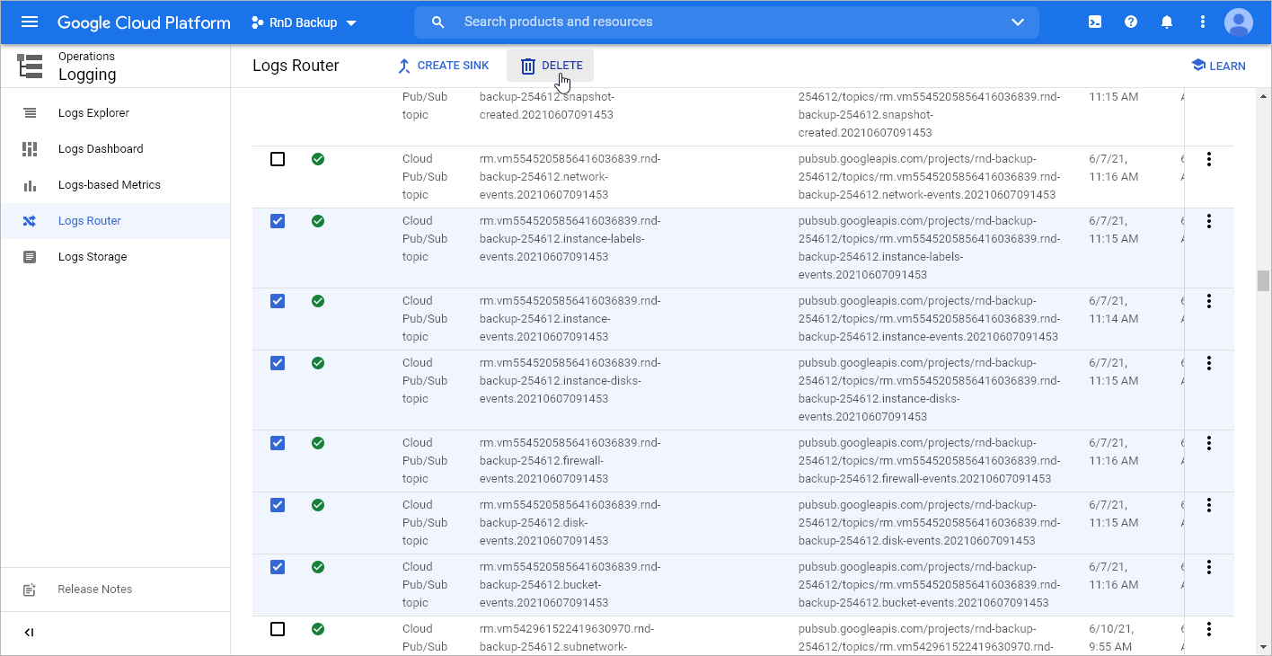 In the list of logs router sinks, locate all sinks with the Cloud Pub/Sub topic type created by Veeam Backup for Google Cloud (the names of these sinks will contain the ID of the VM instance that was running Veeam Backup for Google Cloud), and then delete these sinks.