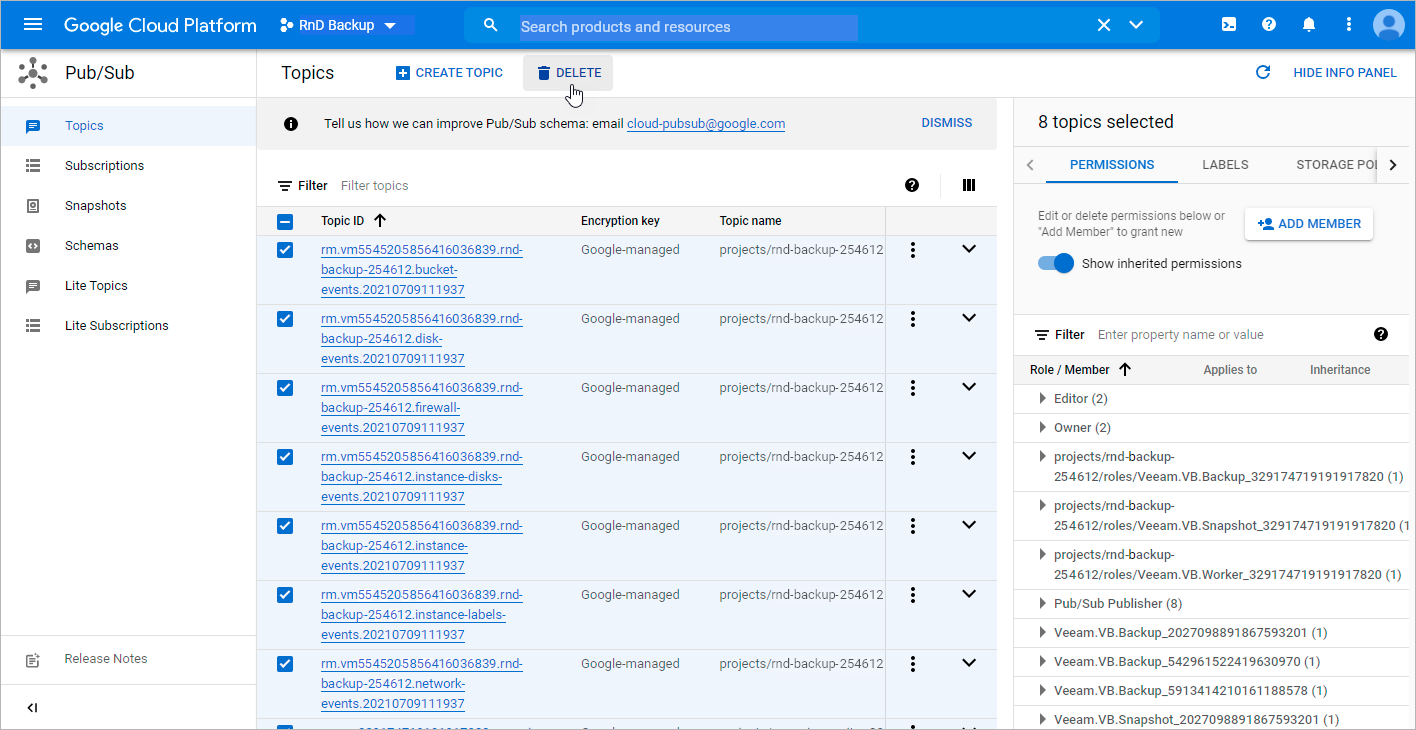 In the list of topics, locate all topics created by Veeam Backup for Google Cloud (the names of these topics will contain the ID of the VM instance that was running Veeam Backup for Google Cloud), and then delete these topics.