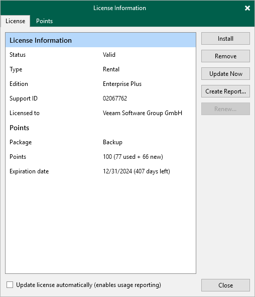 - License ID — the unique identification number of the provided license file (required for contacting the Veeam Customer Support Team).