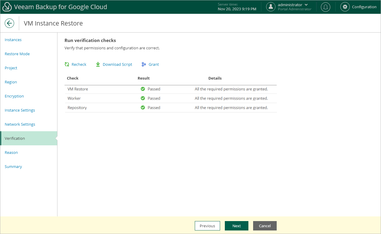 At the Verification step of the wizard, Veeam Backup for Google Cloud will verify whether restore settings are configured properly and the specified service account has all the necessary permissions required to perform recovery tasks for the project that will manage the restored VM instance. For more information on the required permissions, see Service Account Permissions.
