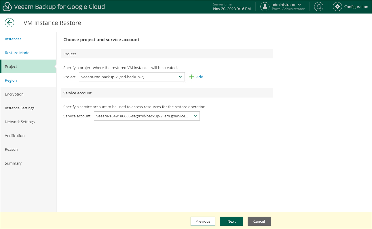 For a project to be displayed in the Project drop-down list, it must be added to Veeam Backup for Google Cloud as described in section Adding Projects and Folders. If you have not added the necessary project to Veeam Backup for Google Cloud beforehand, you can do it without closing the VM Instance Restore wizard. To do that, click Add and complete the Add Projects and Folders wizard.