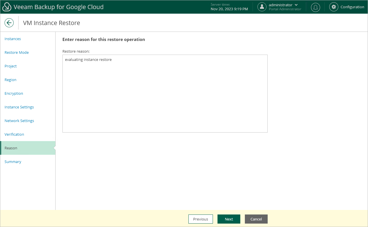 At the Reason step of the wizard, specify a reason for restoring the VM instance. This information will be saved to the session history, and you will be able to reference it later.