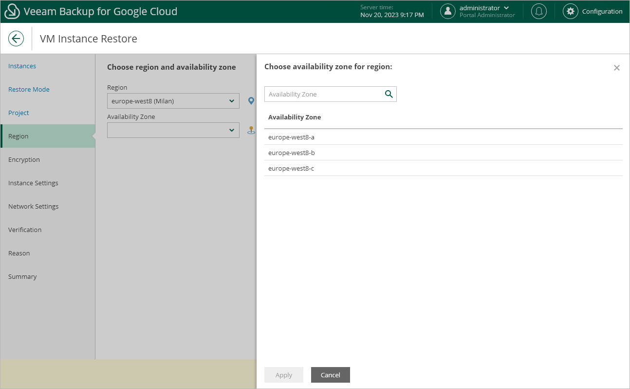 At the Region step of the wizard, select a region where the restored VM instance will operate and an availability zone for which you want to configure network settings.
