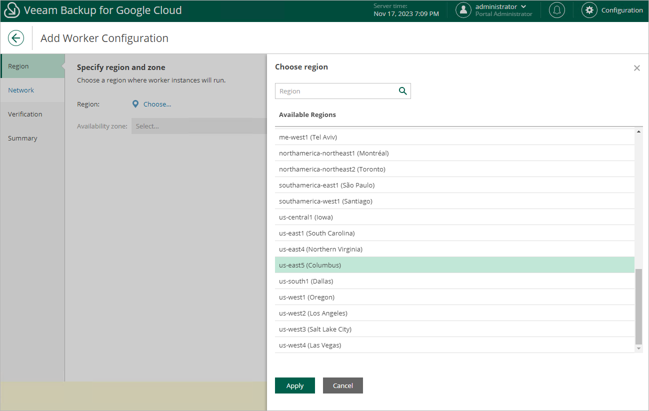 At the Region step of the wizard, select a region where new worker instances will operate and an availability zone for which you want to configure network settings.