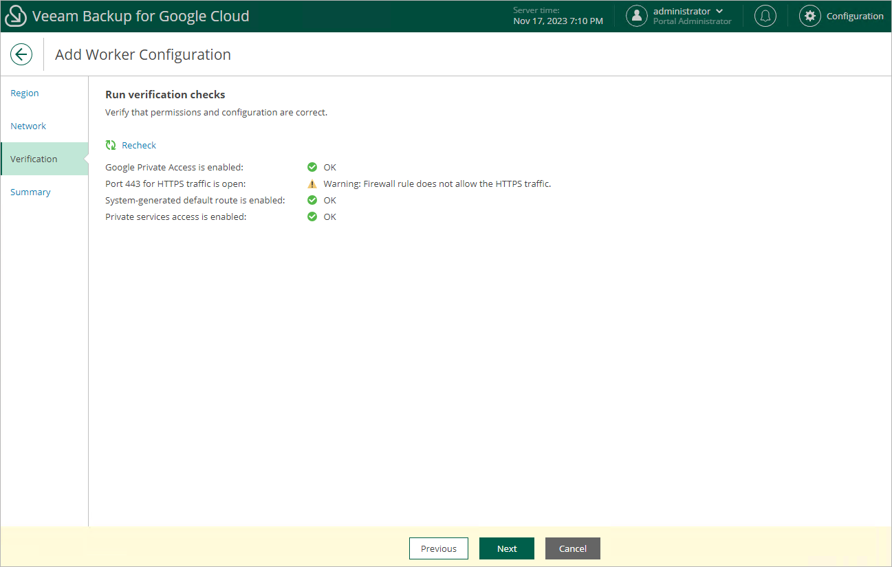 At the Verification step of the wizard, Veeam Backup for Google Cloud will verify whether all the necessary prerequisites required to deploy worker instances based on the new worker configuration are met. For more information on the prerequisites, see Specifying Network Settings.