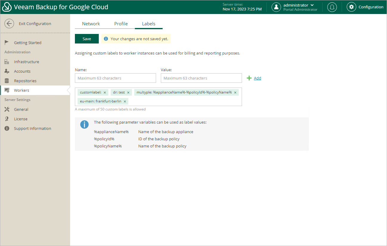 The veeamvbid label is assigned to all newly deployed worker instances automatically and is reserved by Veeam Backup for Google Cloud for internal purposes. |