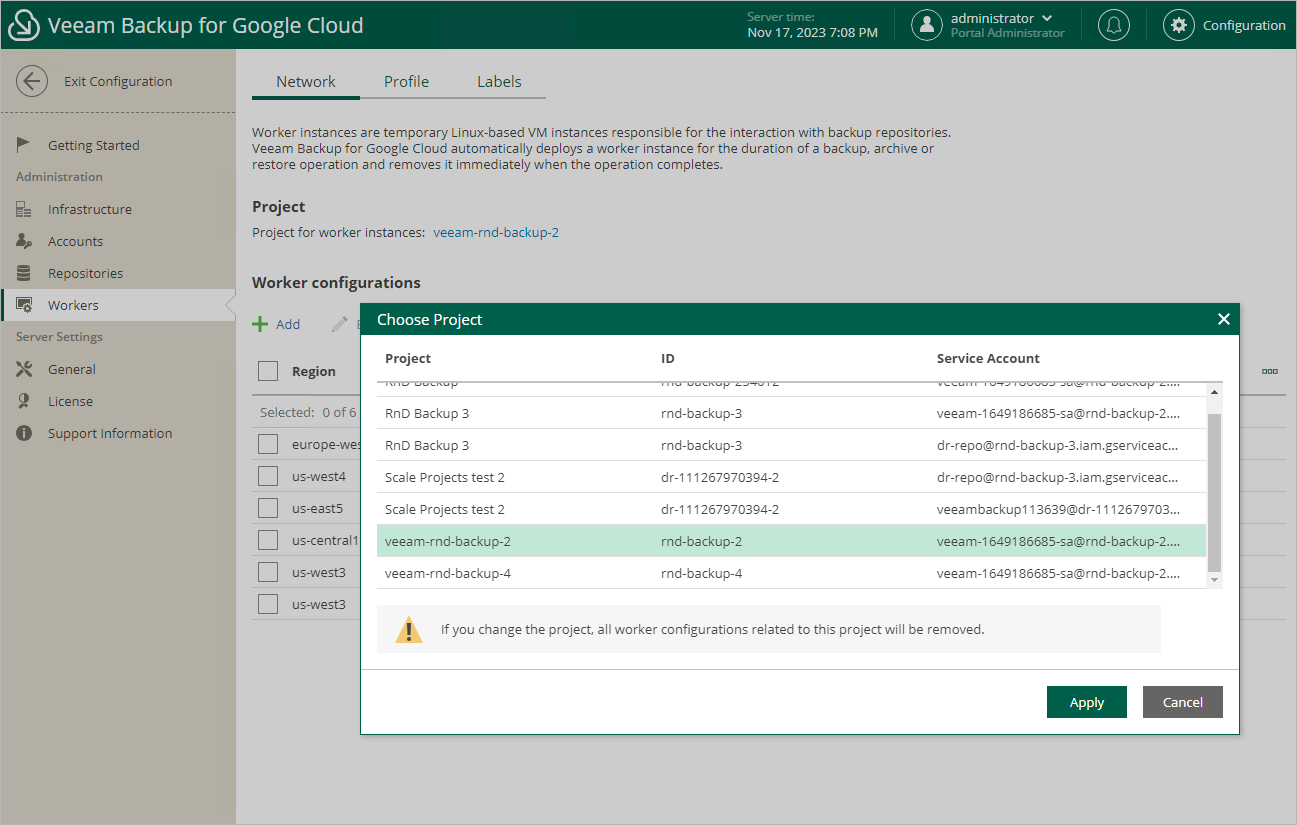 Note that Veeam Backup for Google Cloud does not automatically check whether the service account has all the permissions required to deploy worker instances. That is why you must select the project carefully.
