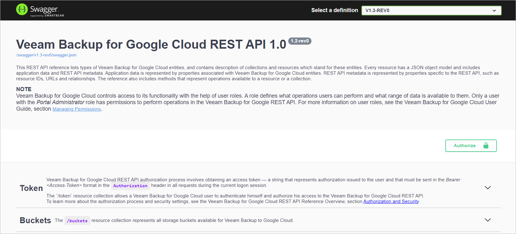 The Veeam Backup for Google Cloud REST API is additionally available through the Swagger UI, a tool that you can use to evaluate and explore capabilities of the REST API. The Swagger UI visually presents API specification files and allows you to work with resources.
