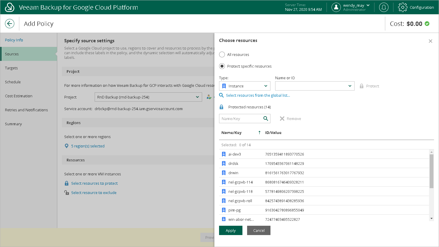 In the Resources section of the Sources step of the wizard, specify the backup scope — select VM instances that Veeam Backup for GCP will back up: