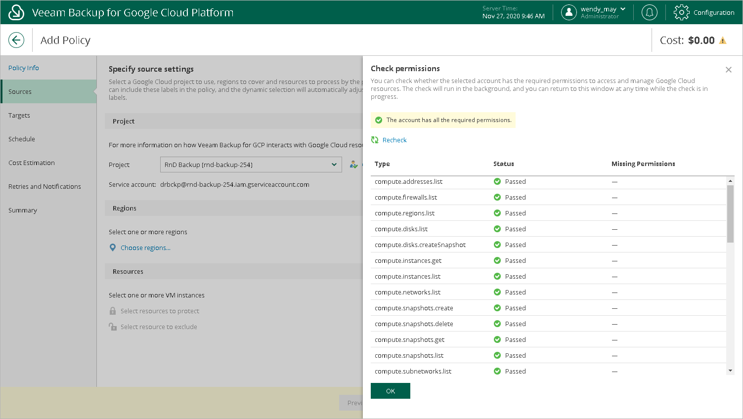 It is recommended that you check whether the service account used to access the selected project has all the required permissions to perform data protection tasks. To do that, click Check permissions. |