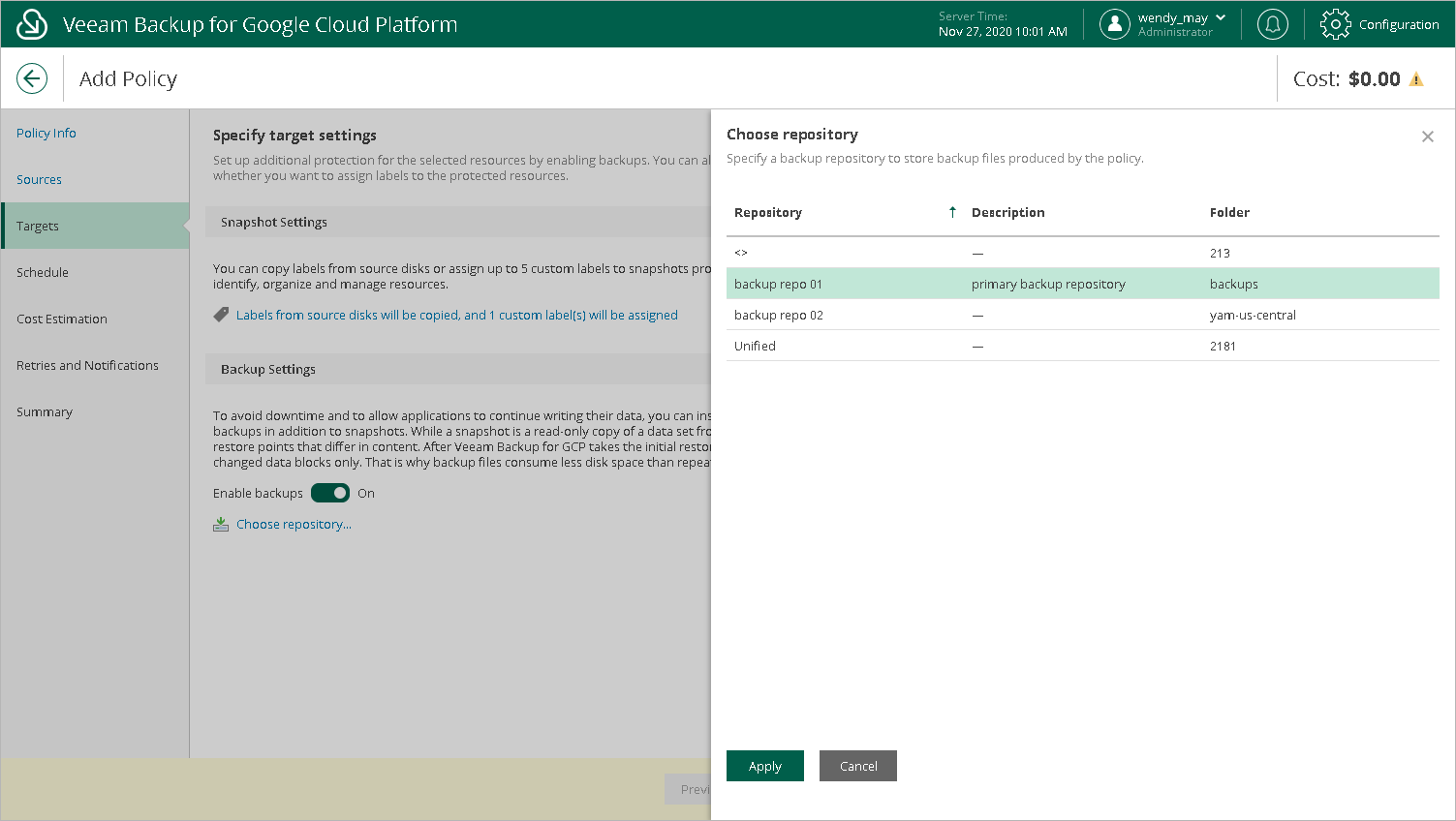 - To save changes made to the backup policy settings, click Apply.