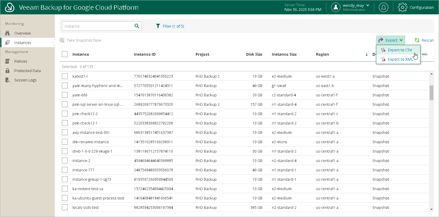 You can export properties of objects managed by Veeam Backup for GCP as a single .CSV or .XML file. To do that, navigate to the necessary tab and click Export. Veeam Backup for GCP will save the file with the exported data to the default download directory on the local machine.