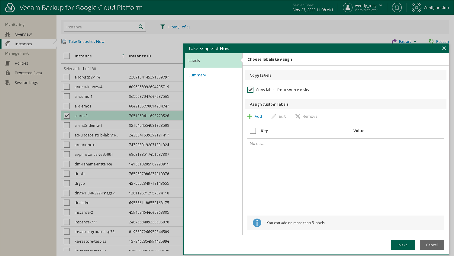- In the Take Snapshot Now wizard, choose whether you want to assign labels to the created snapshot: