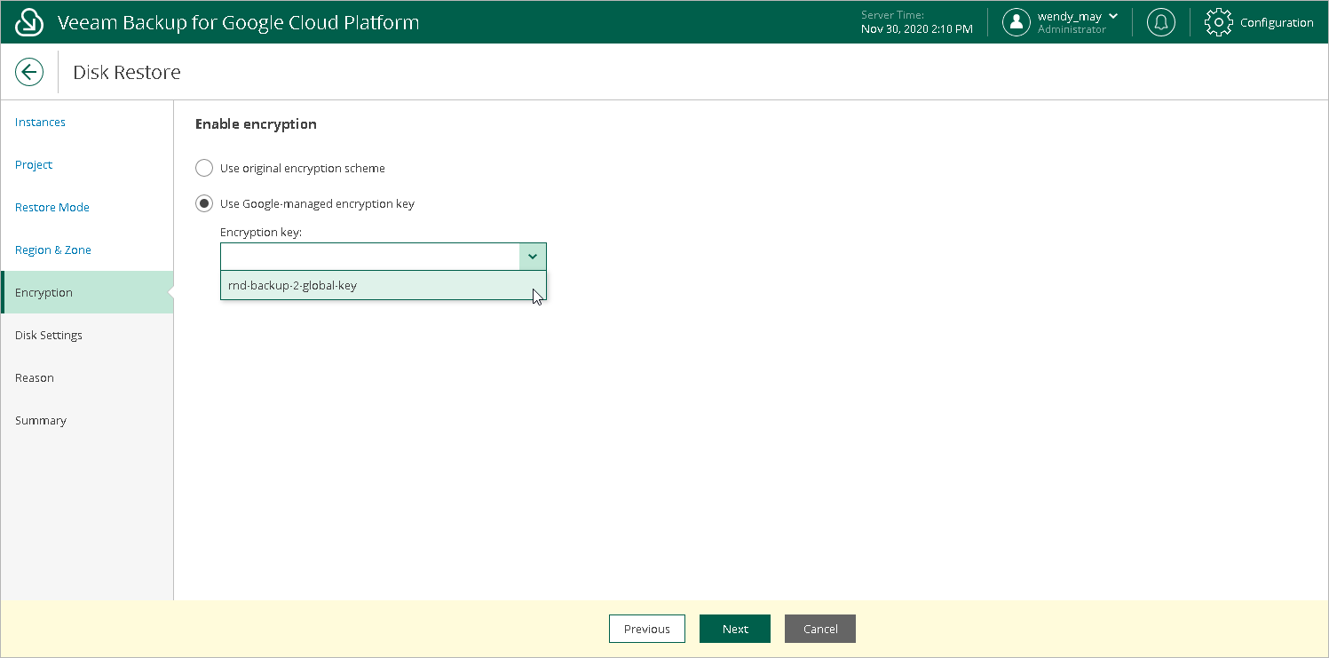 At the Encryption step of the wizard, choose whether the restored persistent disks must be encrypted with Google Cloud Key Management Service (Cloud KMS) customer-managed encryption keys (CMEKs):