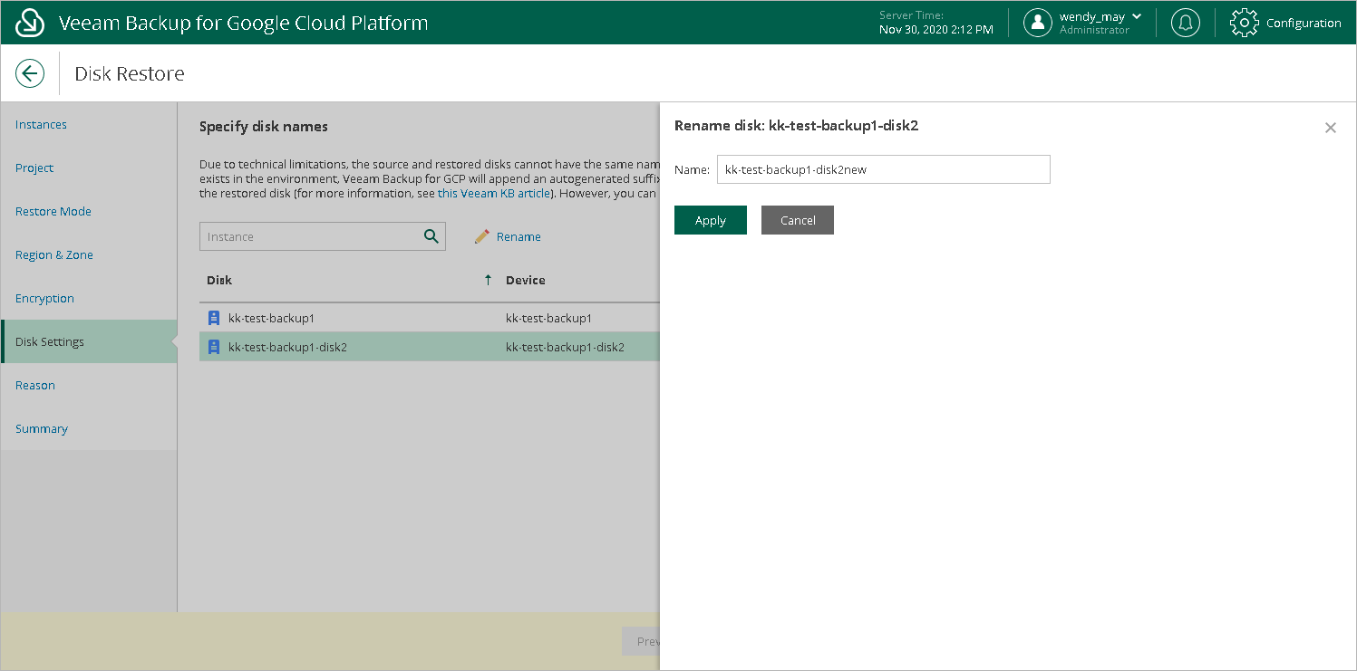 At the Disk Settings step of the wizard, you can specify a new name for each restored persistent disk: