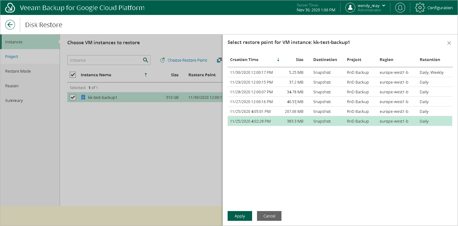 To help you choose a restore point, Veeam Backup for GCP provides the following information on each available restore point: