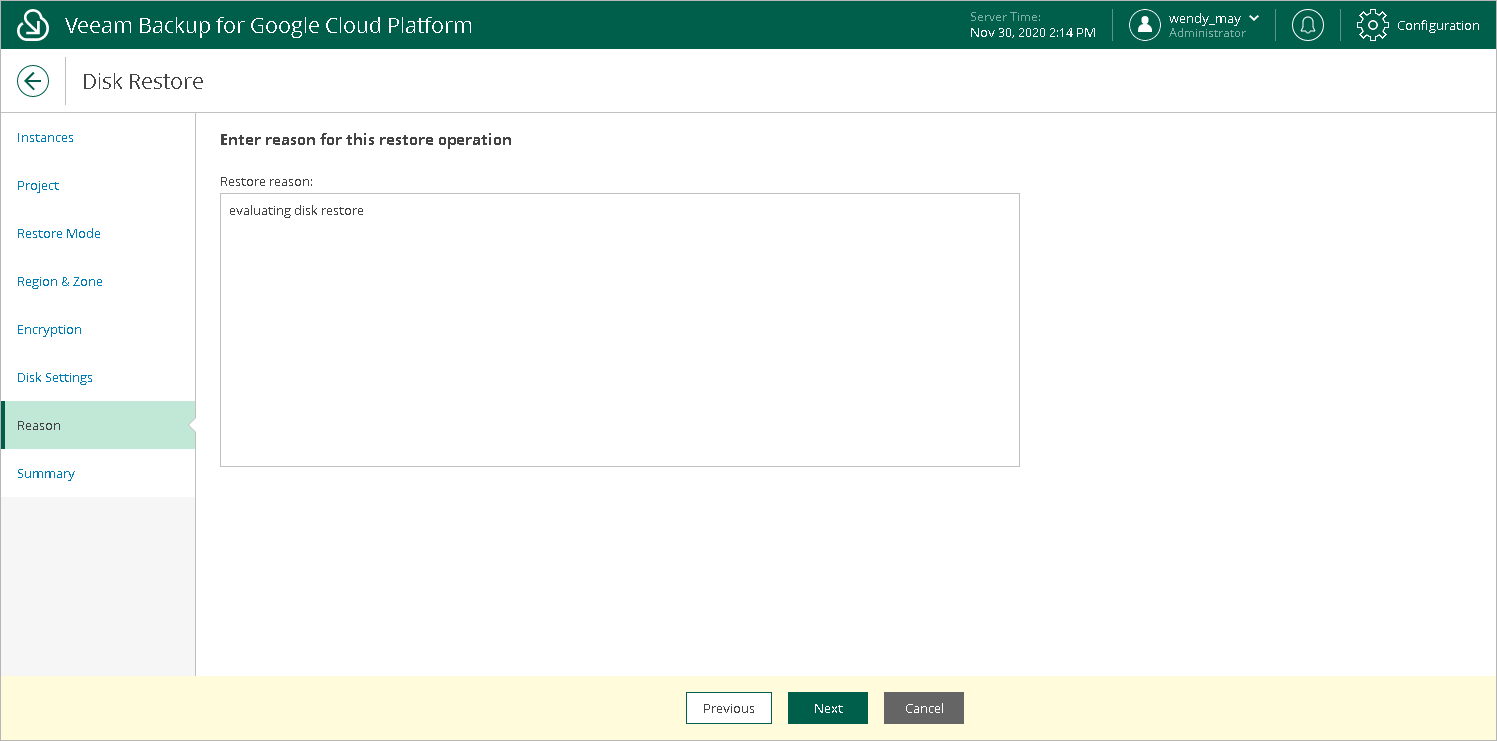At the Reason step of the wizard, specify a reason for restoring the persistent disks. This information will be saved to the session history and you will be able to reference it later.
