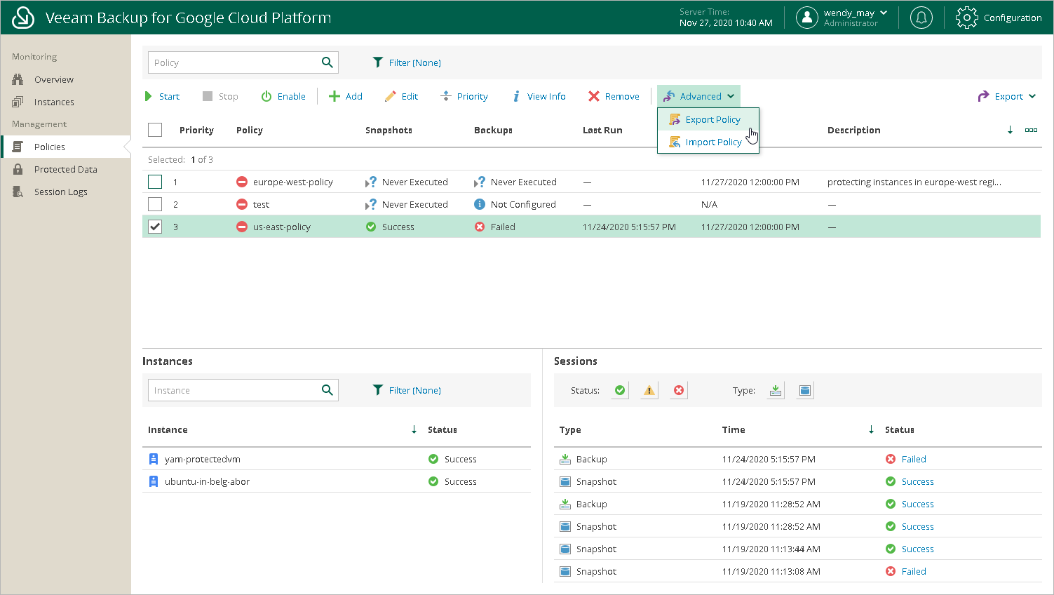 - Select the necessary backup policy and click Advanced > Export Policy.