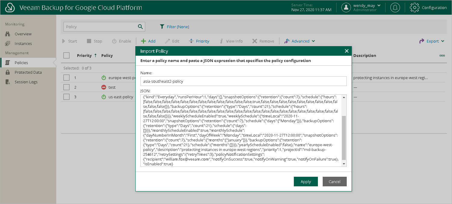 - In the Import Policy window, specify a name for the imported backup policy, paste the content of the necessary .JSON file, and click Apply.