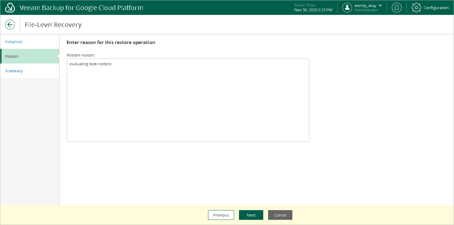 At the Reason step of the wizard, specify a reason for recovering files and folders. This information will be saved to the session history and you will be able to reference it later.