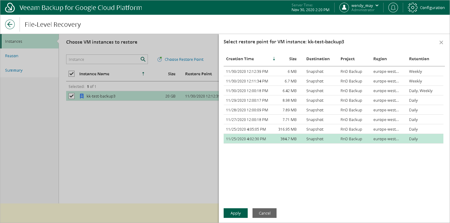 To help you choose a restore point, Veeam Backup for GCP provides the following information on each available restore point: