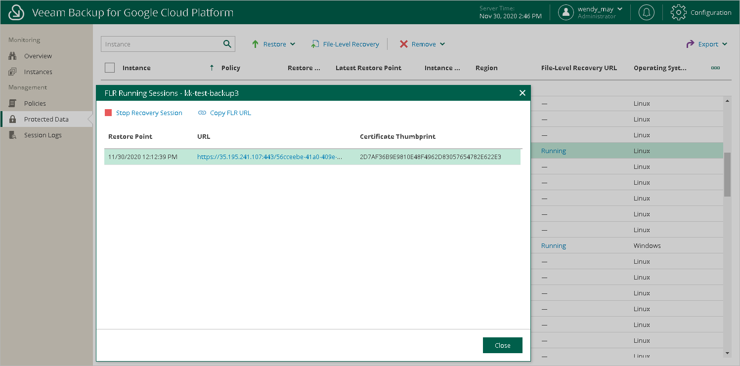 After you finish working with the File Level Recovery for Veeam Backup browser, it is recommended that you stop the running recovery session so that Veeam Backup for GCP can detach persistent disks of the processed VM instance from the launched worker instance and remove the worker instance from the GCP environment.