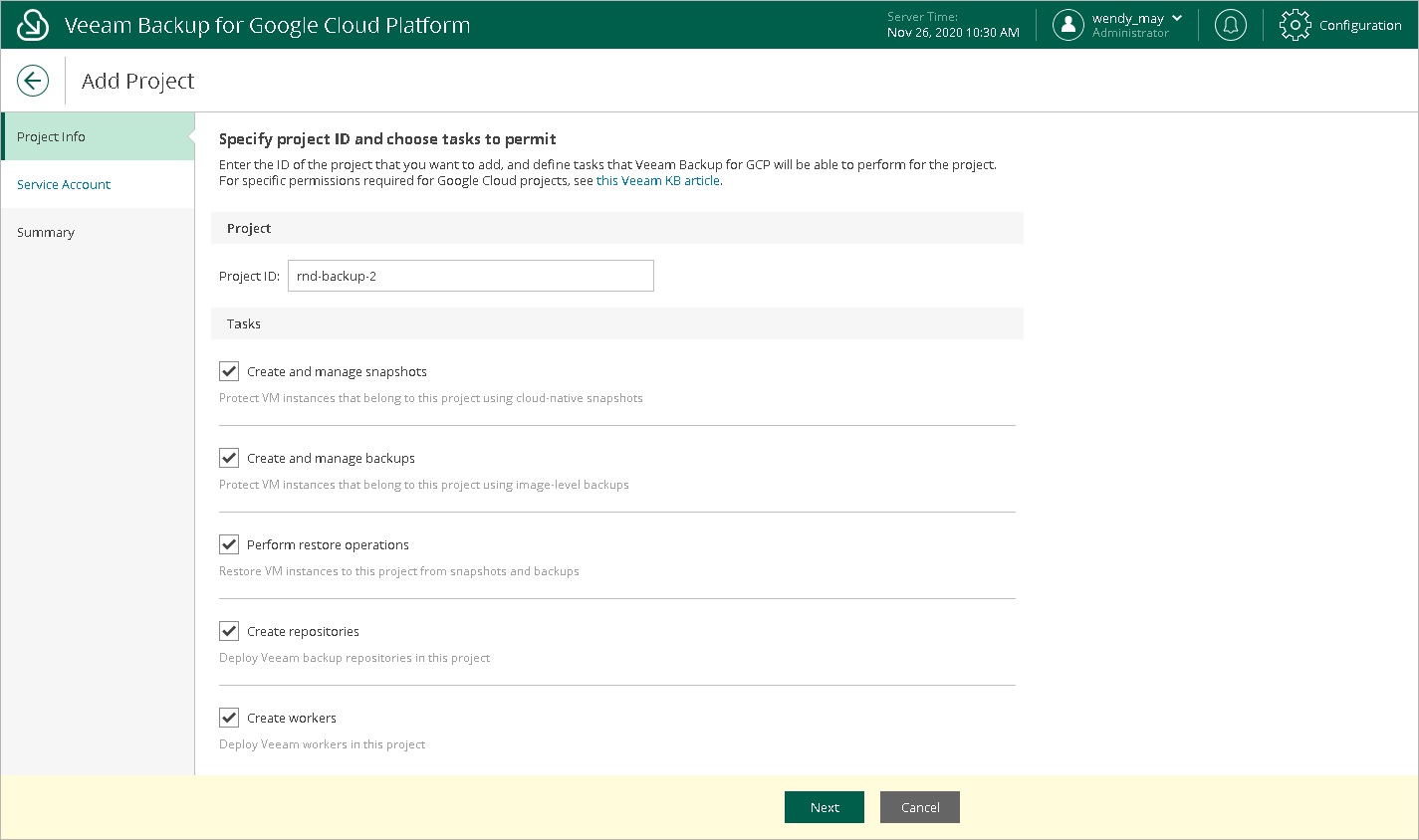 At the Project Info step of the wizard, specify the name or the unique identifier of a project that manages the resources that you want to protect, and choose data protection tasks that Veeam Backup for GCP will be able to perform for the project.