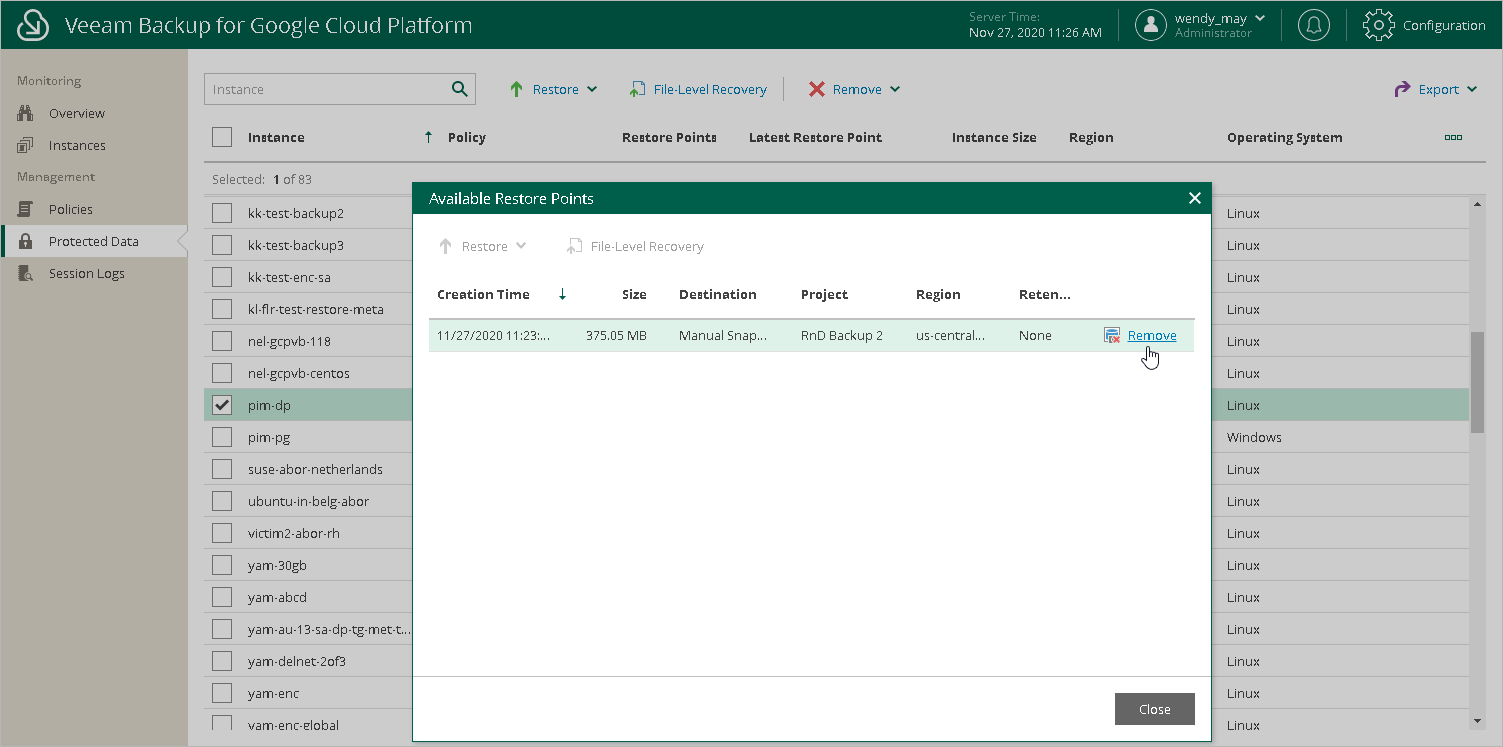 - In the Available Restore Points window, select a snapshot that you want to remove, and click Remove.