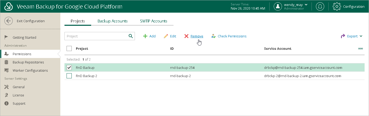 Veeam Backup for GCP allows you to permanently remove a project from the configuration database if you no longer need it:
