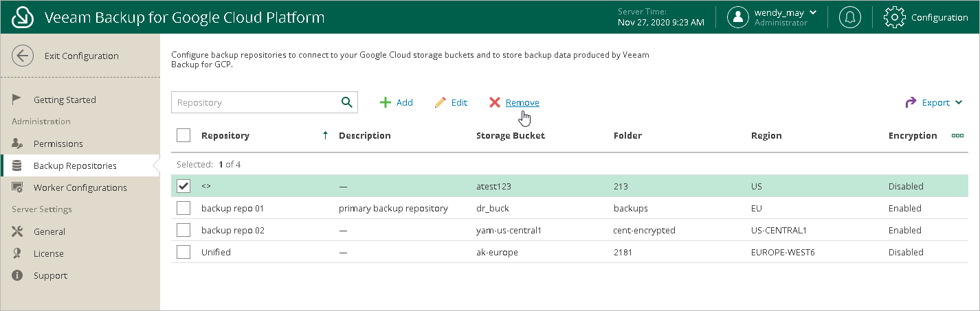 To remove a backup repository from the Veeam Backup for GCP infrastructure, do the following: