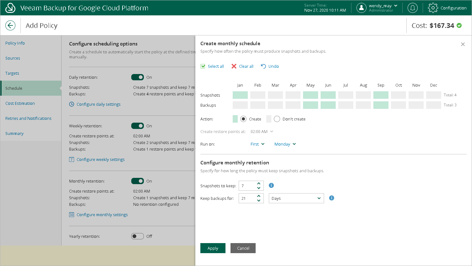 - In the Create monthly schedule window, select months when the backup policy must create cloud-native snapshots and image-level backups.