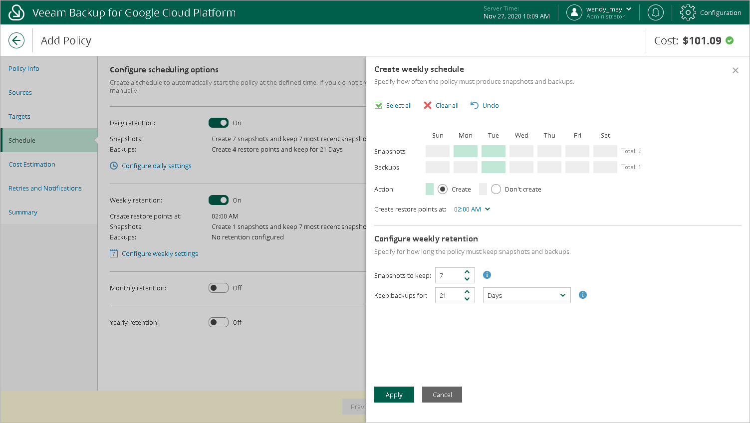 - Use the Create restore points at drop-down list to schedule a specific time for the backup policy to run.