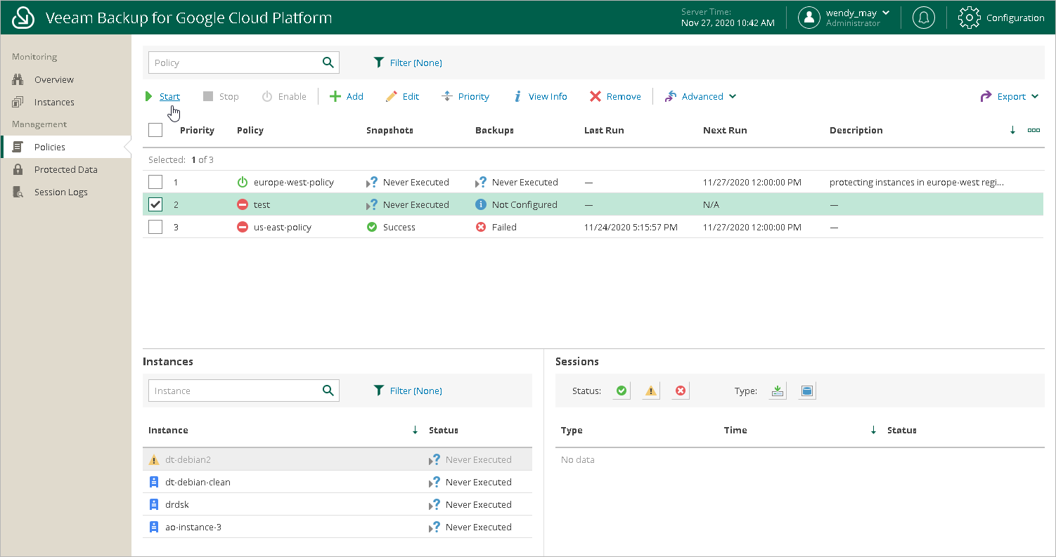 You can start a backup policy manually, for example, if you want to create an additional restore point in the snapshot or backup chain and do not want to modify the configured backup policy schedule. You can also stop a backup policy if processing of a VM instance is about to take too long, and you do not want the policy to have an impact on the production environment during business hours.