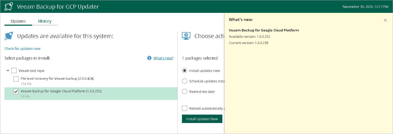 Veeam Backup for GCP automatically notifies you about newly released product versions and package updates available for the operating system running on the backup appliance. However, you can check for the available updates manually if required: