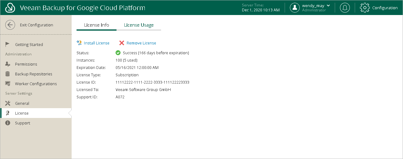 - License ID — the unique identification number of the provided license file (required for contacting the Veeam Customer Support Team).