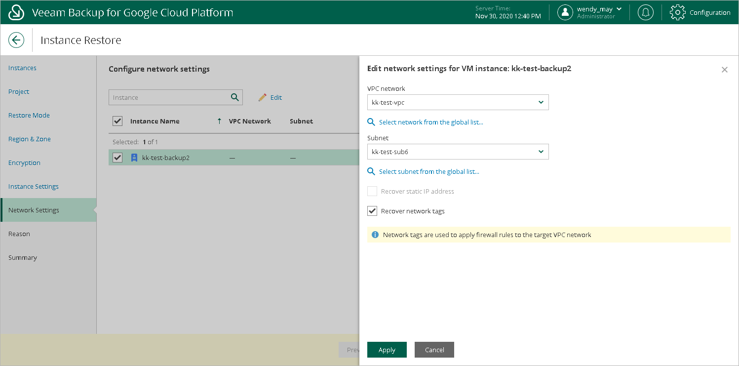- In the Edit network settings window, select a VPC network and a subnet to which the restored VM instance must be connected. You can also choose whether you want the restored VM instance to have the same reserved static external IP address and the same network tags as the source VM instance.