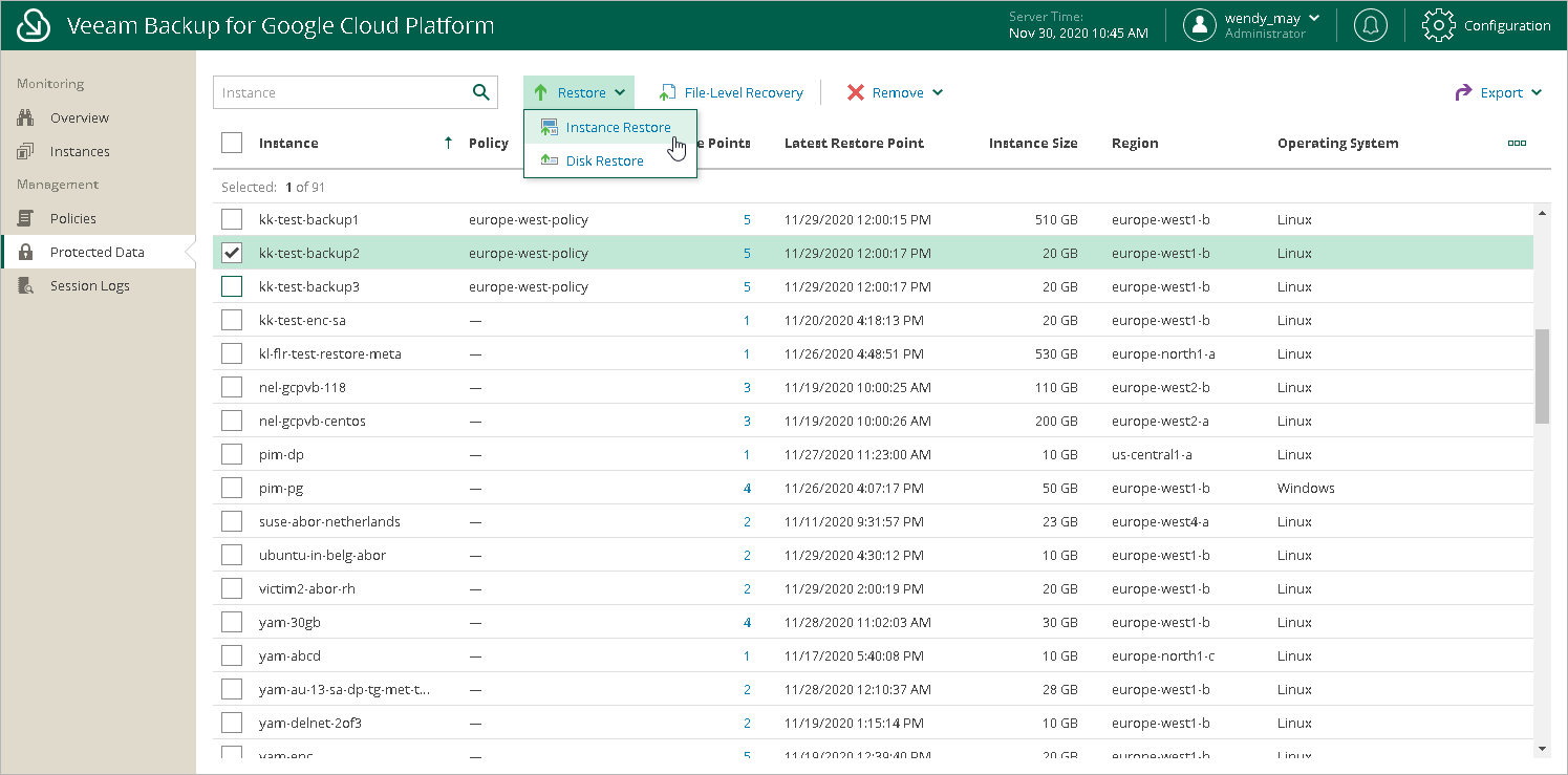 This is an archive version of the document. To get the most up-to-date information, see the current version. Step 1. Launch Instance Restore Wizard In this article To launch the Instance Restore wizard, do the following:Navigate to Protected Data.Select the VM instance that you want to restore, and click Restore > Instance Restore.