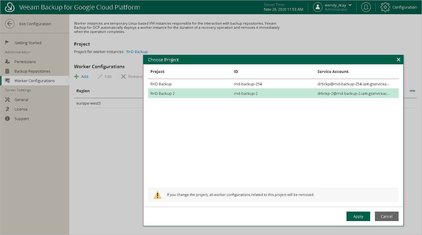 After you choose a project, do not try to change it by clicking the link in the Project section. Otherwise, all created worker configurations will be removed automatically as soon as you choose another project. |