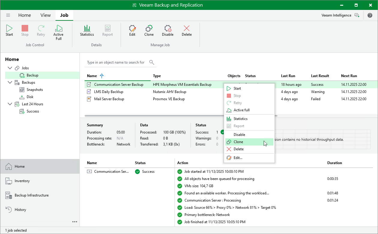 If the original job is scheduled to run automatically, Veeam Backup & Replication disables the cloned job. To enable the cloned job, select it in the job list and click Enable. |