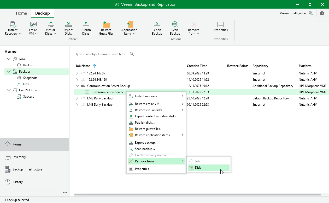 You can permanently delete a backup job from the Veeam Backup & Replication configuration database if you no longer need it. When you delete a job, backups created by this job are displayed under the Backups > Disk (Orphaned) node in the Home view of the Veeam Backup & Replication console. If you want to delete backup files as well, follow the instructions provided in section Deleting Backups.