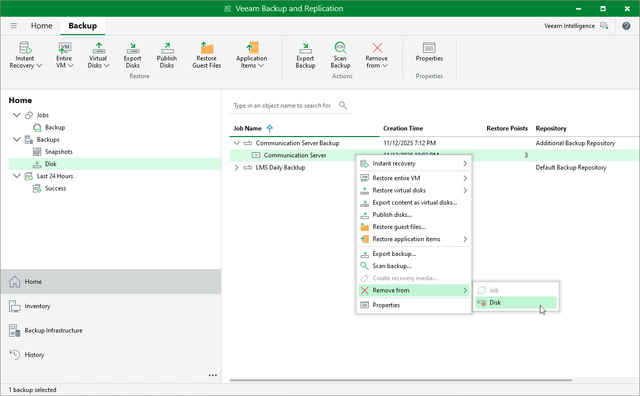- In the working area, expand the job that created the backup, right-click the VM whose backups you want to delete and select Remove from > Disk.