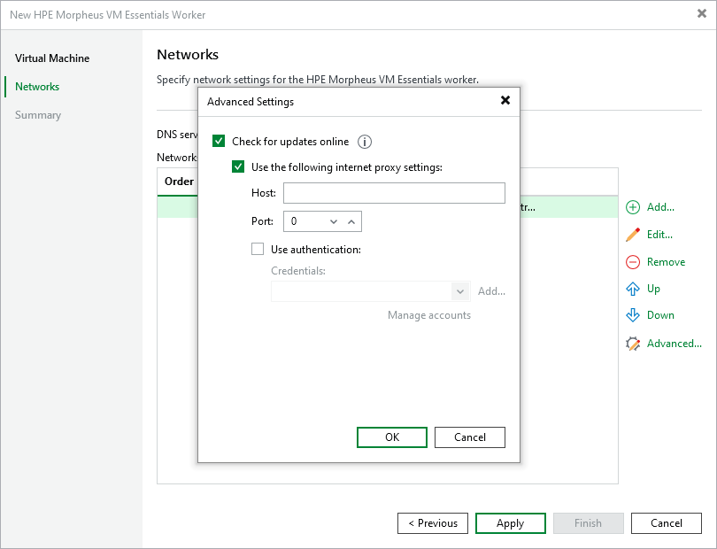 - To check for available package updates for the worker, Veeam Backup & Replication automatically connects to Veeam repositories over the internet. If the worker is not connected to the internet, you can instruct Veeam Backup & Replication to use an HTTP proxy that will provide access to the necessary repositories. To specify HTTP proxy settings, click Advanced and do the following in the Advanced Settings window: