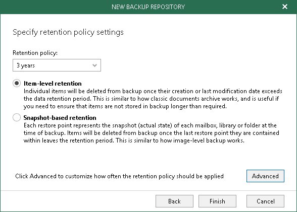 - Snapshot-based retention. To keep an item until its latest restore point is within the retention coverage.
