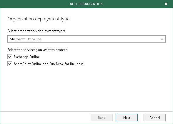- In the Select organization deployment type drop-down list, select Microsoft Office 365.