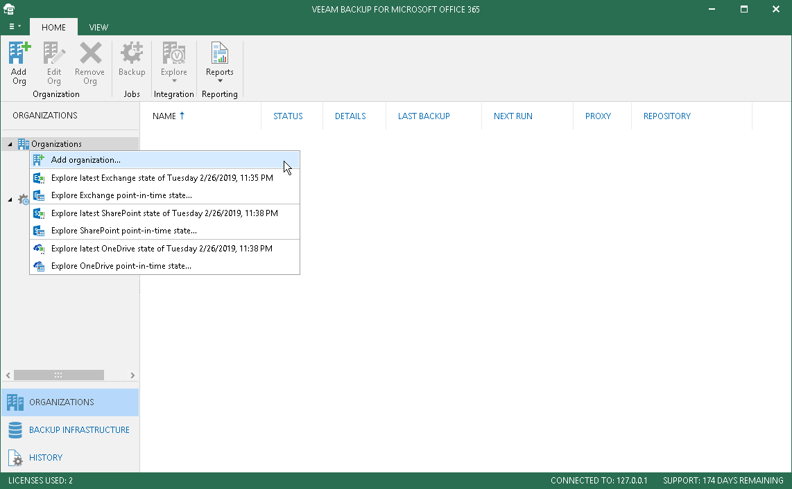 - In the Organizations view, click Add Org on the toolbar or right-click the root Organizations node and select Add organization.