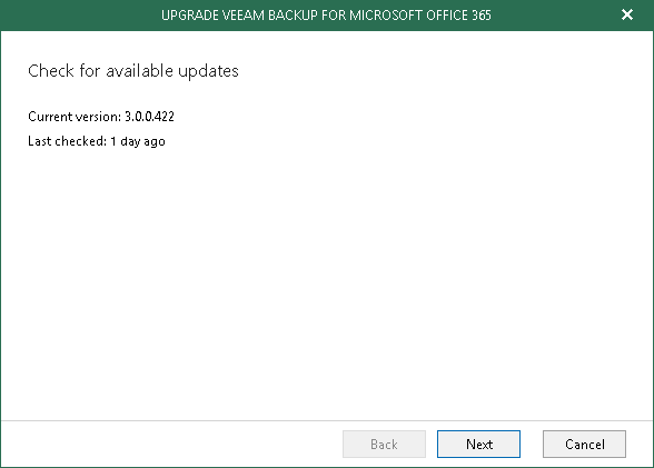 During the upgrade, Veeam closes the Veeam Backup for Microsoft Office 365 console, whereupon you will be offered to go through the setup steps, as described in Installing Veeam Backup for Microsoft Office 365.
