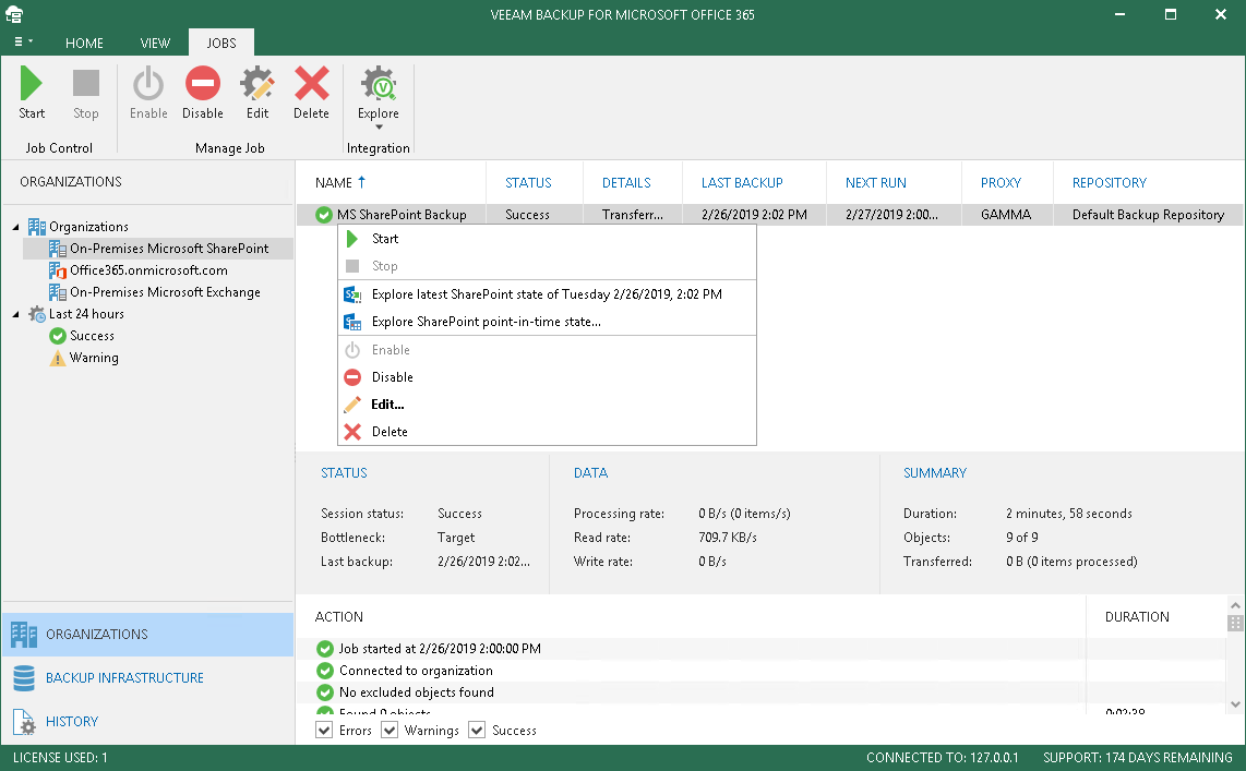 - In the preview pane, select a backup job and click Explore on the toolbar or right-click a backup job and select either of the following options: