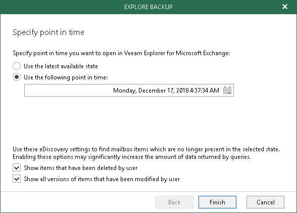 Both Show items that have been deleted by user and Show all versions of items that have been modified by user options retrieve required information from other restore points in your backup repositories and might take additional time to load the data. |