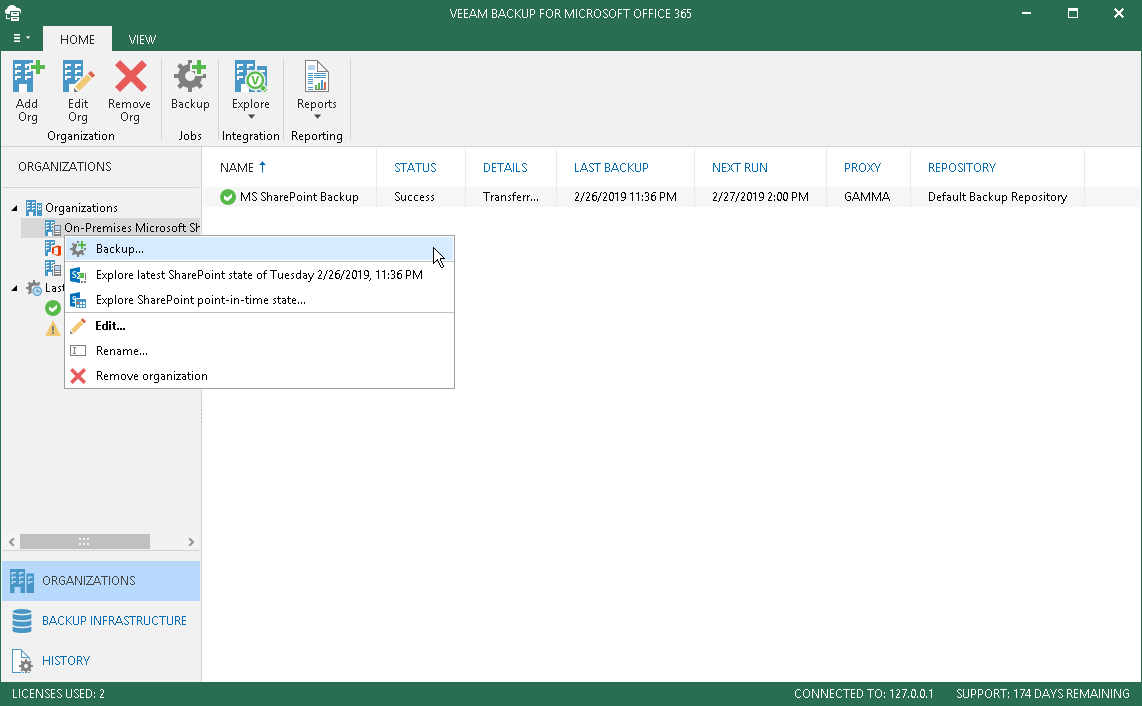 - On the Home tab, click Backup on the toolbar or right-click an organization and select Backup.