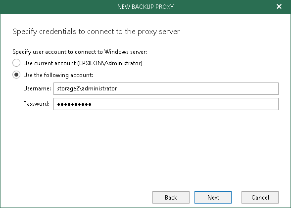 At this step of the wizard, specify an account to connect to the server that you want to use as a backup proxy.